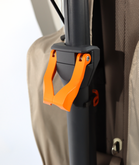- Für den Transport wird der izecc in die "Travel"-Position gebracht. Das Packmaß beträgt dann 90 x 55 x 38 cm und kann somit leicht in den meisten Kofferräumen transportiert werden. Wird der izecc nicht genutzt, kann er aufgrund des geringen Platzbedarfs einfach und platzsparend im Caddyraum gelagert werden.