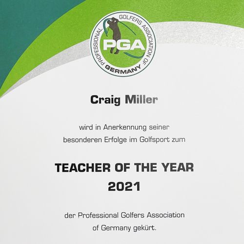 Der Schotte Craig Miller, PGA Golfprofessional im GC Herzogenaurach und Trainer von DP-World-Tour-Spieler Matthias Schmid, ist der „PGA Teacher of the Year 2020/2021“. Als beste Jugendtrainer wurden am 20. Februar im Rahmen der virtuellen Generalversammlung der PGA of Germany im Bereich Breitensport Anja Engelhardt und Verena Scholz für ihre virtuelle Lern- und Übungsplattform „Complete Performance Program“ ausgezeichnet, in der Kategorie Jugendtrainer Leistungssport geht der Preis an Sebastian Rühl, den DGV Bundestrainer der Mädchen. Als herausragende Tourspielerin beziehungsweise Tourspieler der beiden vergangenen Jahre wurden Sophia Popov und Bernhard Langer geehrt.