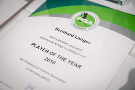 Leidenschaft für den Golfsport – die ist auch bei Bernhard Langer spürbar, bei jedem seiner Auftritte. Leidenschaft und sportliche Weltklasse. Das honorierten die Mitglieder der PGA of Germany einmal mehr, indem sie für den inzwischen 61-Jährigen zum bereits vierten Mal als „PGA Player of the Year“ stimmten. Mit zwei Turniersiegen, sechs zweiten Plätzen, 14 Top-10-Ergebnissen und dem insgesamt 7. Gewinn des Charles Schwab Cup feierte der Anhausener auch 2018 eine phantastische Saison auf der PGA Tour Champions. „Diese Auszeichnung bedeutet mir deshalb besonders viel, weil sie von meinen in Deutschland tätigen Berufskolleginnen und Berufskollegen kommt. Von Menschen, die sich tagtäglich mit dem Golfsport beschäftigen und darin absolute Fachleute sind. Herzlichen Dank für Eure Stimme und die damit verbundene Wertschätzung“, so Langer in einer Videobotschaft. Auch im letzten Jahr hatte Bernhard Langer den PGA Player-Award gewonnen. Auf den Plätzen 2 und 3 der Abstimmung folgen in der Herren-Konkurrenz 2018 Xander Schauffele und Stephan Jäger.