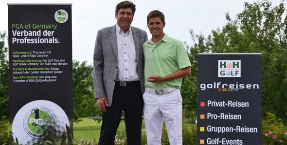 von Matthias LettenbichlerWißmannsdorf − Der PGA Golfprofessional gewann das Turnier im Golf-Resort Bitburger Land mit Runden von 73 und 68 Schlägen, spielte gesamt 3 unter Par auf dem anspruchsvollen Par-72-Parcours in Wißmannsdorf. Am Finaltag gelang dem 24-Jährigen dabei die beste Runde des gesamten Wettbewerbs. Rang 2 teilten sich mit jeweils 1 unter Par Dennis Lohrmann (74+69), Lucas Francisco Iturbide (73+70) und Oliver Eckstein (70+73). Uwe Dillinger belegte Platz 5 (71+73). Der Engländer Colin Monk, der das Turnier nach einer 69er-Runde im ersten Durchgang angeführt hatte, teilte letztlich Platz 6 (69+76/+1). Dominik Weißer erhielt für seinen Triumph beim ersten von in diesem Jahr insgesamt drei Turnieren der H&H Golf PGA Club Professional Series ein Preisgeld von 2000 Euro und herzliche Glückwünsche von Stefan Quirmbach, dem Präsidenten der PGA of Germany (links auf dem Foto unten), der auch selbst am Wettbewerb teilgenommen hatte. Insgesamt waren 61 Spieler am Start und nutzten die Gelegenheit, sich mit den Kollegen zu messen, die vorwiegend unterrichten; die H&H Golf PGA Club Professional Series ist den Mitgliedern der PGA of Germany vorbehalten, deren Alltag nicht aus Turniergolf sondern auf dem Unterrichten besteht.